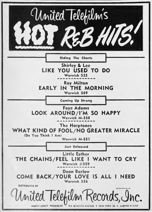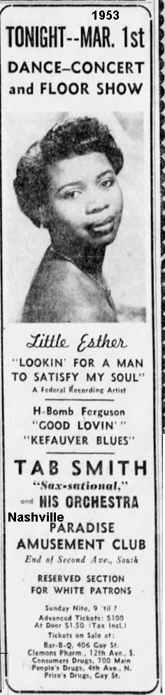There was nothing in the press about what her punishment was, but it couldn't have been all that much, because she was back on the road by March 1955, appearing at the Ritz Ballroom, in Bridgeport, Connecticut, on the 18th. Whereas once she was the show's headliner, she was now listed after the Harptones, Stick McGhee, and Annie Laurie.