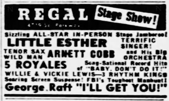 On August 10, Little Esther and Redd Lyte were at the Roosevelt Theater in Pittsburgh. I imagine the rest of the gang was there too, but they were the only ones mentioned in the small ad.