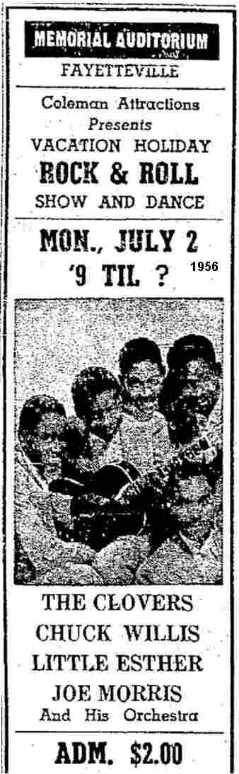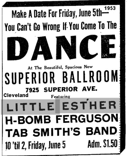 On Monday July 2, 1956 Esther was part of the Vacation Holiday Rock & Roll Show And Dance at the Memorial Auditorium in Fayetteville, West Virginia. She shared the stage with the Clovers, Chuck Willis, and the Joe Morris Orchestra.