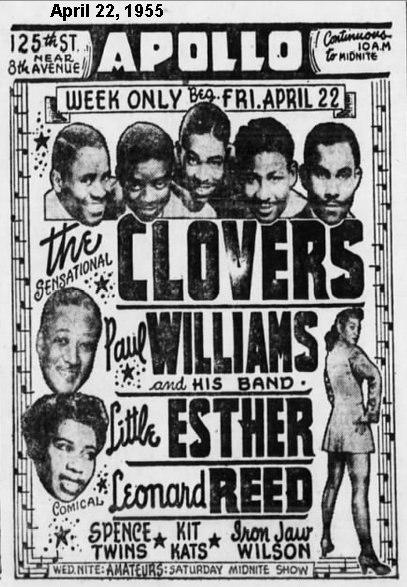 Little Esther made it back to the Apollo the week of April 22, 1955. This time, the Clovers were the main draw; Esther was listed below bandleader Paul Williams (although in the same size font). The April 23 New York Age said: "Little Esther, a sensational artist in her first records of 'Misery' and 'Double Crossing Blues' a few years ago, ends her long absence at the Apollo theatre. A grown up lady now, Esther has lost the childish awkwardness of youth, and is now an accomplished showman with a style of her own."