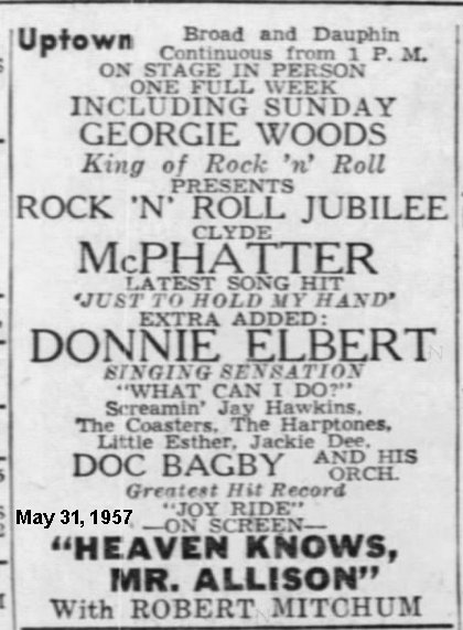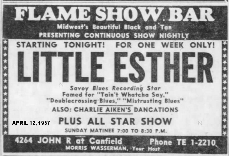 The only appearances I could find for Esther in all of 1957 were at the Flame Show Bar in Detroit for the week starting April 12, and the Uptown Theater in Philadelphia the week of May 31, where she shared the stage with Clyde McPhatter, Donnie Elbert, Screamin' Jay Hawkins, the Coasters, the Harptones, and Doc Bagby. Her name was in small letters and near the end.