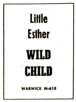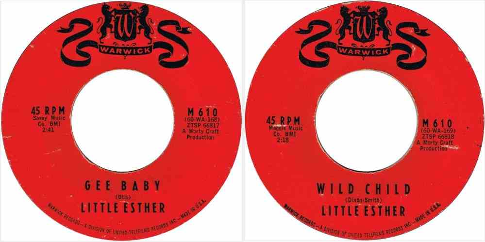 "Feel Like I Wanna Cry" and "The Chains" were released in July 1960, but don't seem to have been reviewed. "Gee Baby" and "Wild Child" came out in December of that year and were reviewed in Billboard's December 31 edition: "Wild Child" (3 stars): "Little Esther returns to wax with a listenable performance of a swinging blues effort. Backing rocks, too. Side will interest her fans." "Gee Baby" got 2 stars: "Tender bluesy effort is sung with some style here by Esther, over attractive piano and ork support. Flip is stronger." The wording seems to indicate that Warwick never sent them the first record to review (or, at least, the reviewer wasn't aware of it). Note that "Gee Baby", a tune written by Johnny Otis, had been a Savoy Mel Walker vocal ten years previously.