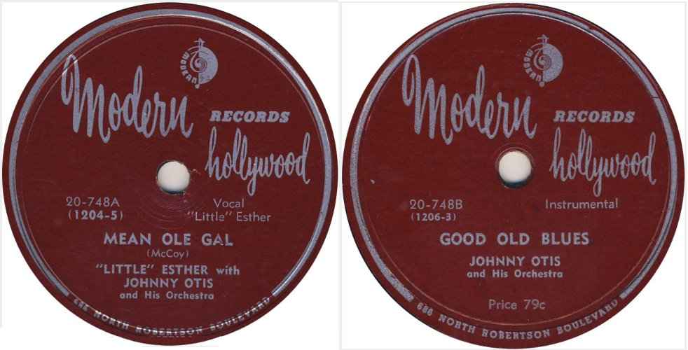 Her first record, released in November 1949, was "I Gotta Guy", backed with Otis' "Thursday Night Blues". But there was a problem: Modern's label read "I Gotta Gal - vocal Esther Jones". The next month it was reissued with the correct title (and vocal by "Little" Esther), but not before the original had been reviewed in the December 3 Billboard. It received a 73 ("Thrush Esther Jones leaves hardly a note unbent as she weaves her way appealingly thru a bluesy ballad."). [And yes, you can forget the mythical story about Otis and Savoy Records's owner, Herman Lubinsky, deciding to call her "Little Esther" in January 1950.]