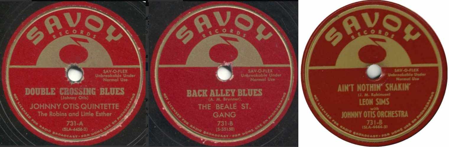 So now we know that "Double Crossing Blues" was the clear winner from that session, when it became Esther's first Savoy release in January 1950. What's not so easy to determine is the flip. You've got two choices: "Back Alley Blues" by the Beale St. Gang and "Ain't Nothin' Shakin'" by Leon Sims and the Johnny Otis Orchestra. They both show up in Billboard at various times. Since "Double Crossing Blues" was such a big hit, the flip side was dragged along with it on the charts and "Back Alley Blues" was mentioned through July 1950. However, "Ain't Nothin' Shakin'" was mentioned in the Cash Box review of the record in January 1950, a February 1950 chart, and a May 1950 Savoy ad. So which was the original flip? I just don't know, although "Back Alley Blues" is the far more common pairing.