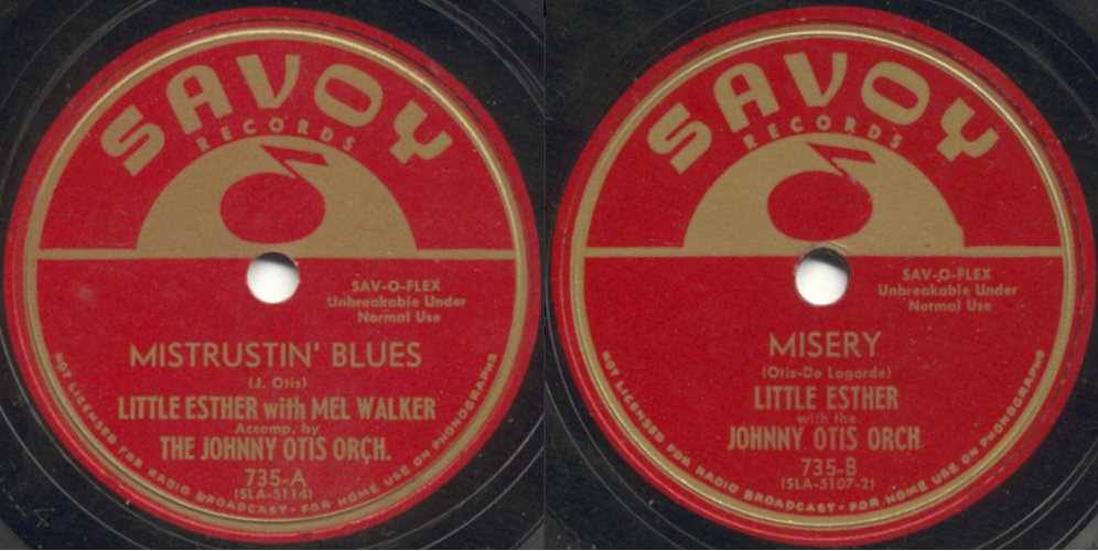 In March, Savoy released "Mistrustin' Blues", backed with "Misery". They were reviewed in the March 18, 1950 Cash Box: "Little Esther is presently hot as a pistol in juke boxes everywhere and you can never tell when one of her platters is going to turn into another smash. 'Mistrustin' Blues' gets an added dash of sauce with a chorus that has Mel Walker joining the thrush in excellent fashion. Disk features a blues intro that is inviting and the strong tempo of a low-down beat winding in and around Little Esther's vocalizing. 'Misery' shows Esther again in a torchy, effective ballad with a lot of shmaltz. Walker turns in a very good job. If there was such a thing as a 'Jazz 'N' Blues' sleeper this disk would grab it!" Considering where it is in the paragraph, I'm not sure what "Walker turns in a very good job" is supposed to mean; he wasn't on "Misery".