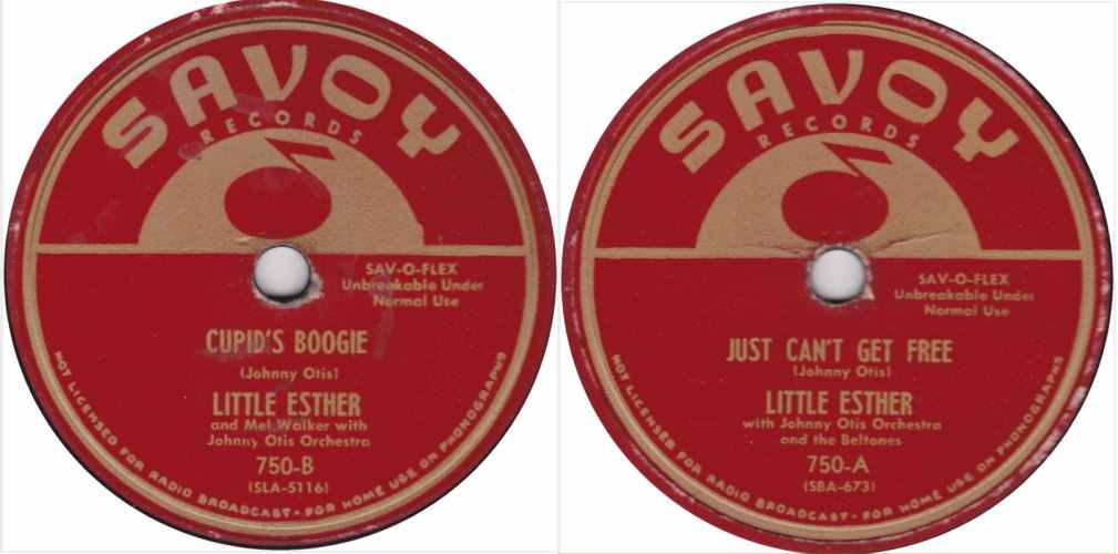 There's no stopping this gal! Following on the heels of her sock success via "Mistrustin' Blues" and "Double Crossing Blues," chirp Little Esther comes up with a big one in this excellent rendition of "Cupid Boogie" and "Just Can't Get Free." The gal's great set of tonsils pitch the flavor of this pair in top notch manner from start to finish. Top deck is the one they'll go wild about. Mellow tempo of the Johnny Otis ork coupled with Little Esther's superb vocal job will surely catch on in a big way.