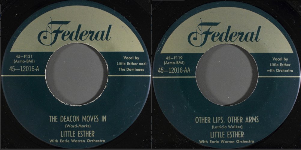 Federal released "The Deacon Moves In" and "Other Lips, Other Arms" in February 1951. "The Deacon Moves In" was credited to "LITTLE ESTHER" and, in much smaller letters, "Vocal By Little Esther and The Dominoes". The sides were reviewed in the March 3 Billboard, which gave "The Deacon Moves In" a whopping 86 ("Dominoes quartet joins Little Esther for an exciting novelty performance that crashes to a wild climax."). The flip only got a 74 ("The young thrush debuts on Federal with an expressive, husky slow ballad job, with neat orking in back.").