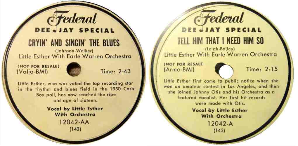 And then, something strange happened. While Johnny Otis continued to record for Savoy, Little Esther started recording for Federal (backed by the Earle Warren Orchestra). Earle Warren had been an alto sax player and vocalist with Count Basie and was now the road manager of Otis' orchestra. Was Otis' orchestra actually used on Federal with Earle Warren's name as a cover? I asked the question of Billy Vera and this was his answer: