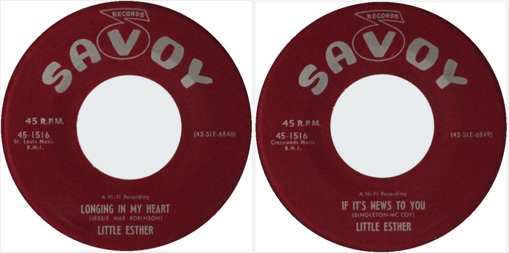 It took Savoy a year to release her next record: "Longing In My Heart", backed with "If It's News To You", came out in June 1957. Cash Box rated them both "B" in their July 20, 1957 edition. "Longing In My Heart": "Little Esther wails a slow beat blues in a style that comes through with strength. The lass tells her love story with simplicity and effectiveness." "If It's News To You": "Little Esther rocks to a middle beat on the flip. Good Lindy dance item with Little Esther knocking out the beat in infectious fashion."