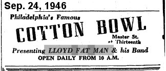 A September 24, 1946 ad places him at the Cotton Bowl in Philly. He was advertised as "Lloyd Fat Man & His Band".