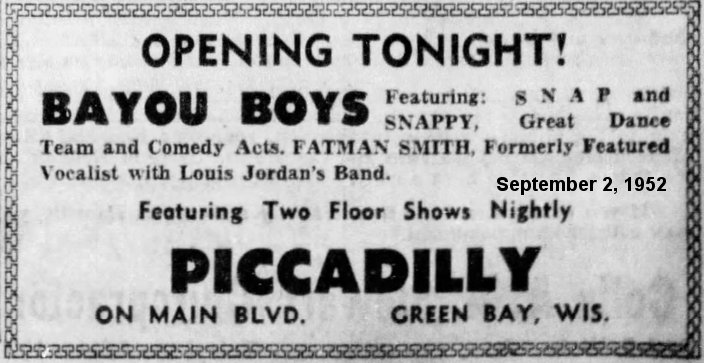 On September 2, 1952, the Bayou Boys appeared at the Piccadilly, in Green Bay, Wisconsin. On the 23rd, it was the Crossroads in Kansas City. Their recordings are so wild, I can't begin to imagine what they were like in person.