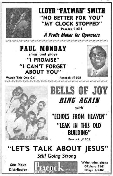 Fatman Smith and the Bayou Boys (ABC): 3; Instrumental-vocal; Peacock. Piano-guitar-bass trio features Fatman Smith, formerly with Louis Jordan. Unit now playing the east. ["ABC" is their booking company; the "3" indicates there were three of them (presumably Fatman was the bassist); the Peacock Lounge was in Chicago.]