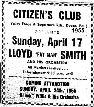 Lloyd the Fat Man, more widely known as the Fat Man Mambo, and his orchestra, will play at a dance to be sponsored by Marcus Hook AA at its clubhouse [in Chester, PA].... [It would be on May 1.]