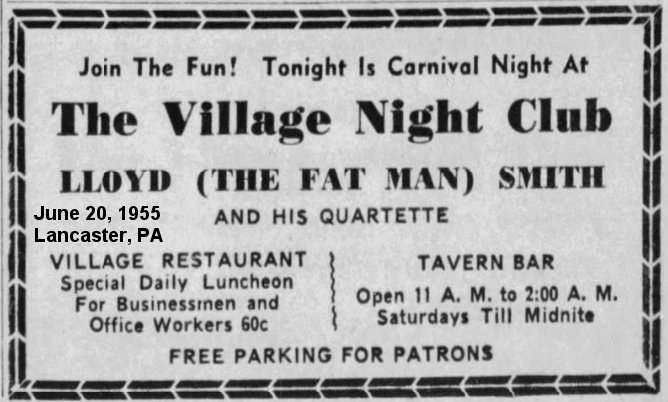 By the time he appeared at the Village Night Club, in Lancaster, PA, on June 20, 1955, his orchestra was advertised as "his quartette".