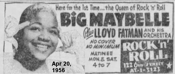 Then, it was an extended appearance at the Rock 'N' Roll Room in Pittsburgh. He was first mentioned there when Otis Williams & the Charms appeared the week of April 9. The April 14 Pittsburgh Courier said: "The Rock and Roll Lounge is rocking to the tunes of Otis Williams and his Charms, youthful singing group, and rollicking Lloyd Fatman and his orchestra." A week later, the Courier said: "Lloyd Fatman, currently appearing in his second week at the Rock 'n' Roll Lounge, is the same Fatman who used to sing as a solo around these parts." So far so good; then they ruined it: "The Pittsburgh native now has his own group, playing out of New York." On April 20, the second act was Big Maybelle. I don't know if he was there continuously, but he was advertised again on June 18, this time with Chuck Berry.