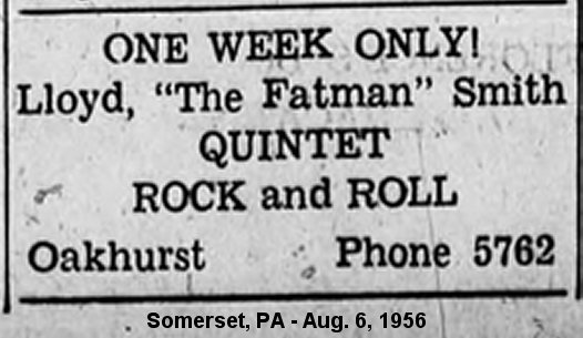 Back to Pennsylvania, to appear at the Oakhurst, in Somerset, on August 6 (Lloyd "The Fatman" Smith Quintet). On August 13, it was a week at the Midway Lounge in Pittsburgh. The August 13, 1956 Pittsburgh Post-Gazette confused us all with this: