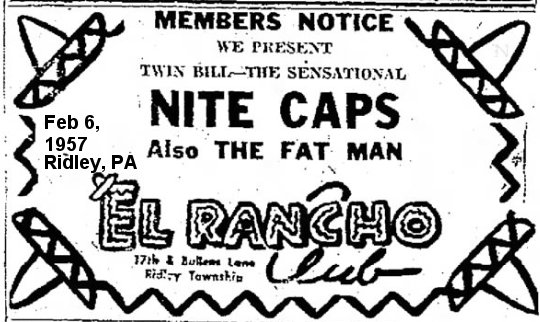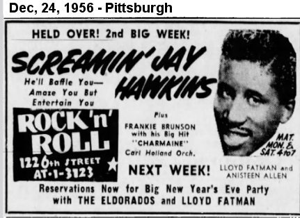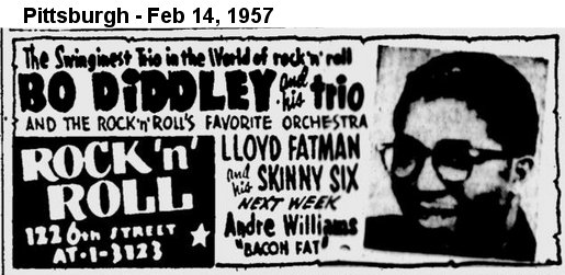 Fatman was at Pittsburgh's Rock 'n' Roll Room for New Year's Eve, along with the El Dorados and Annisteen Allen. He was back the week of February 14, 1957, this time with Bo Diddley, after having completed a week at the El Rancho, in Ridley, PA. The ad called Fatman "The Rock 'n' Roll's Favorite Orchestra". This is the only time his band had a name: "The Skinny Six".