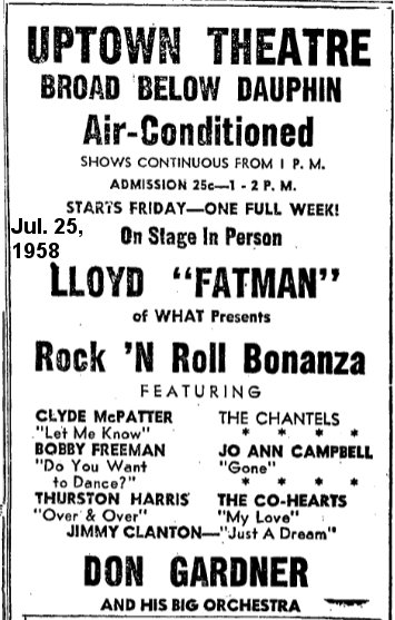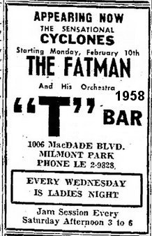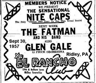 On February 10, 1958, Fatman made a return visit to the "T" Bar in Milmont Park, PA; he hadn't been there since 1954. The week of July 25, he was the MC at the Uptown Theater (Philly), presenting Clyde McPhatter, Bobby Freeman, Thurston Harris, the Chantels, Jo Ann Campbell, the Co-Hearts, Jimmy Clanton, and Don Gardner's orchestra.