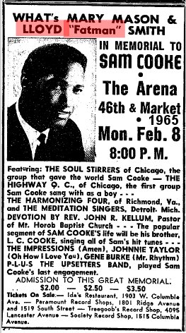 On February 8, 1965, he was the MC at a Sam Cooke memorial held at The Arena. Sam's songs were sung by his brother, L.C. Cooke, who'd been in the Magnificents.