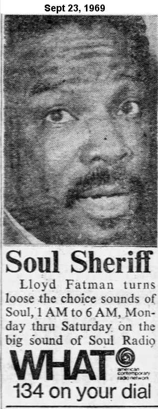 Fatman was the MC for a Lou Rawls concert, at the Philadelphia Academy Of Music, on February 23, 1969. A September 1969 WHAT ad for the "Soul Sheriff" managed to print "134 on your dial", instead of 1340.