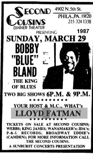 On March 29, 1987, Fatman was the MC at a Bobby "Blue" Bland concert at Second Cousins Dinner Theater.