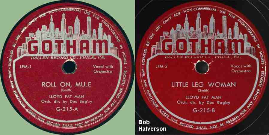 His first record (as "Lloyd Fat Man") was released on Gotham, around November 1949. With the Doc Bagby Orchestra, he'd recorded "Roll On, Mule" and "Little Leg Woman. "Roll On, Mule", which he wrote, was a pretty useless tune, seemingly thrown together to take advantage of Frankie Laine's up-and-coming "Mule Train".