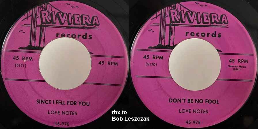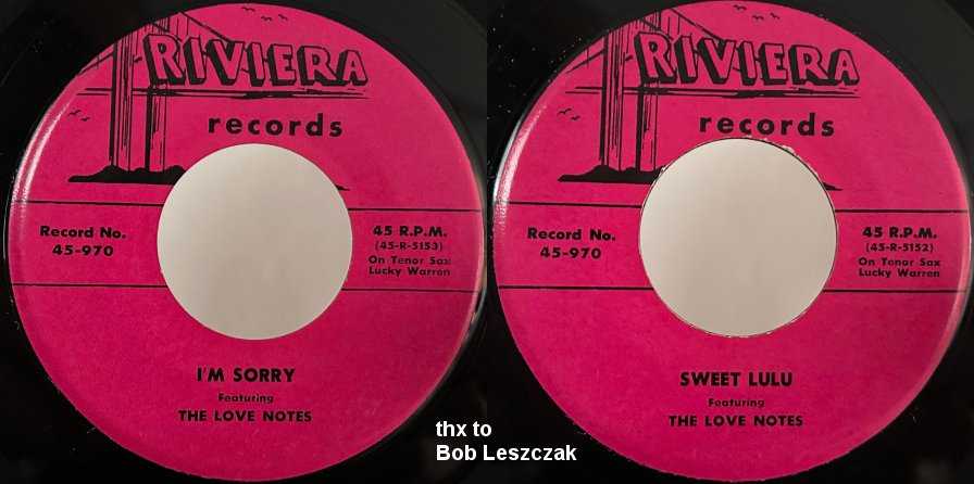On August 21, 1954, Eddie Heller, owner of Rainbow Records announced the signing of the Love Notes. The deal came, once again, through Cecil Steen. This alliance produced two records (on Rainbow's Riviera subsidiary), both of which again did well locally. (There is still no answer to why the Riviera records were released six months before Heller announced the start of the label in Billboard with the 5 Crowns' "Oo Wee Baby". Actually, Riviera, as an affiliate of Rainbow, existed in 1950, when it was announced that big band singer Bob Eberle had been signed to it. It had started out life as a new company called Gay Records in early June; a week later, it had been renamed Riviera.)