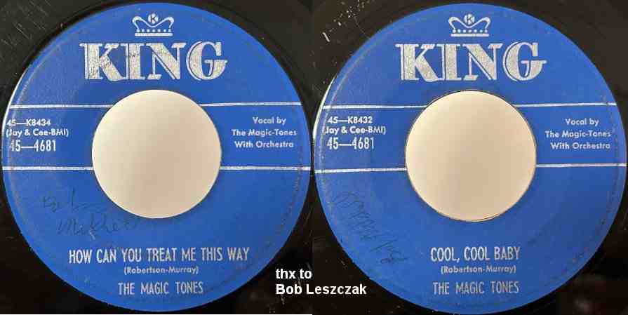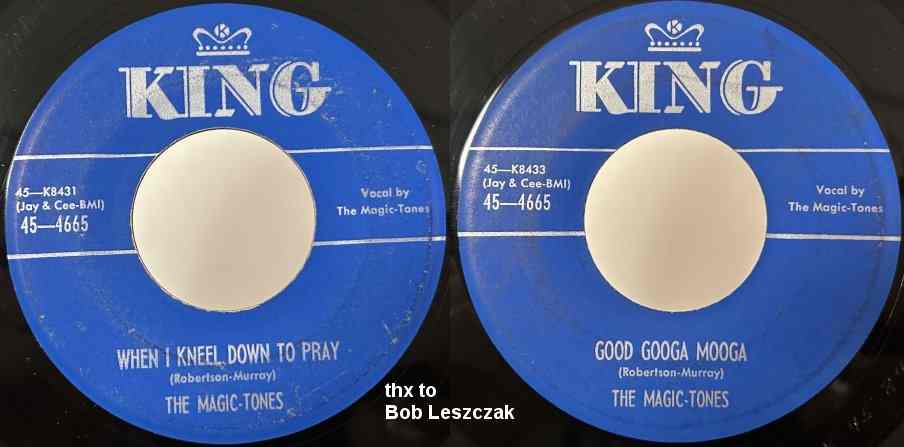 Turned out that Robertson and Murray had a few more songs up their collective sleeve and these they gave to the Magic-Tones (although Gene Hawkins later claimed that he and Willie Stokes wrote them all). Robertson and Murray also secured a contract for the guys with King records and, on August 21, 1953, the Magic-Tones recorded four songs in a New York session. These all had Joe Reed in the lead, since R&M decided that there was no reason for the Magic-Tones to try and sound like the Ravens (they were right, of course). The songs were: "When I Kneel Down To Pray", "Cool, Cool, Baby", "Good Googa Mooga", and "How Can You Treat Me This Way".