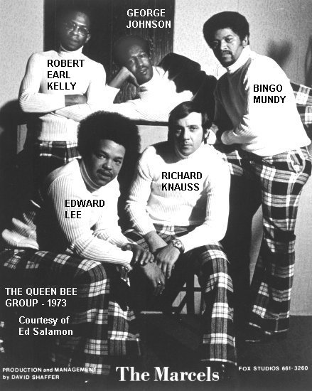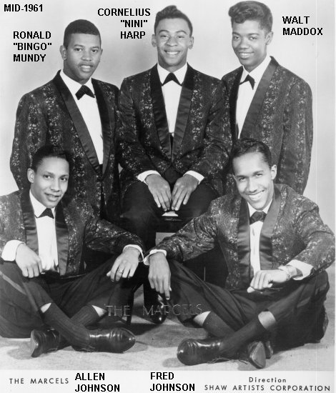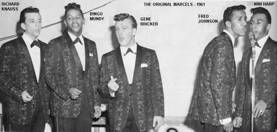 The Marcels began their career in Pittsburgh, Pennsylvania in 1959. Forming at Oliver Allegheny High School, they originally consisted of Cornelius "Nini" Harp (lead and guitar), Ronald "Bingo" Mundy (first tenor), Gene Bricker (second tenor), Richard Knauss (baritone), and Fred Johnson (bass). [A racially-mixed group, Cornelius, Ronald, and Fred were black; Gene and Richard were white.] The name came from the wavy "marcelled" hairstyle (think back to early Dick Powell movies).