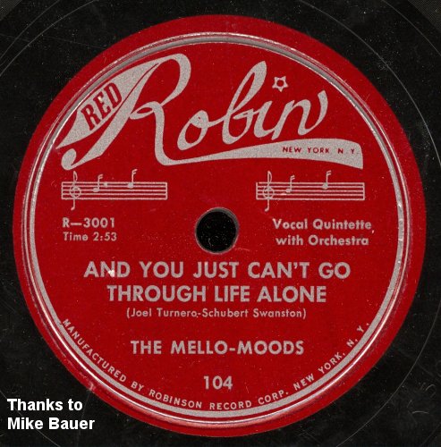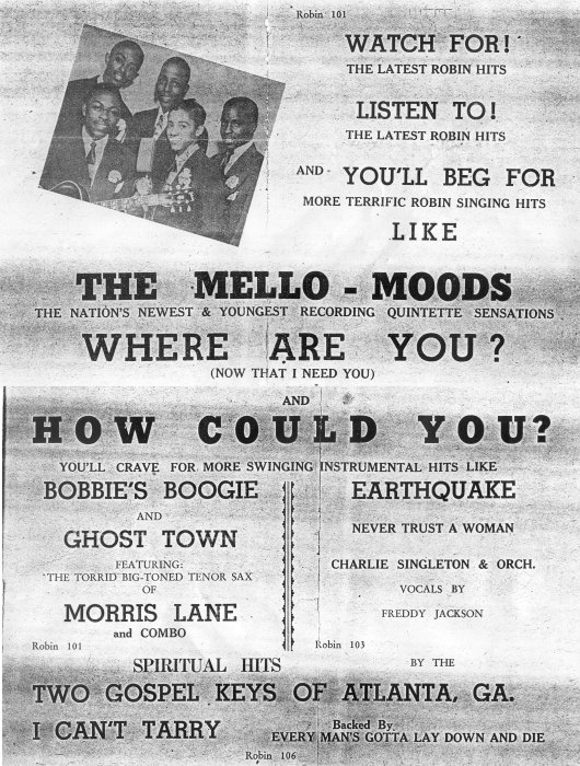 The tunes were released in December as Robin 105. Robin Records were distributed by Jubilee, and ads for "Where Are You" appear along with ads for the Orioles' "Baby Please Don't Go" and Buddy Lucas' "Diane." Note that Robinson issued his first three records using a numbering scheme which assigned only odd numbers to his records: 101, 103, and 105. When the owners of the other Robin Records, in Tennessee, stopped him from using the name, he simply changed it to Red Robin. At that time, Robin 101, 103 and 105 were reissued as Red Robins. (Since a 78 rpm copy of Red Robin 105 has recently surfaced, it's reasonable to assume that number 103 will also turn up someday.) Then he switched to a more conventional system, issuing numbers 102 and 104 on Red Robin. Thus, the second Mello-Moods release would have a lower number than the first.
