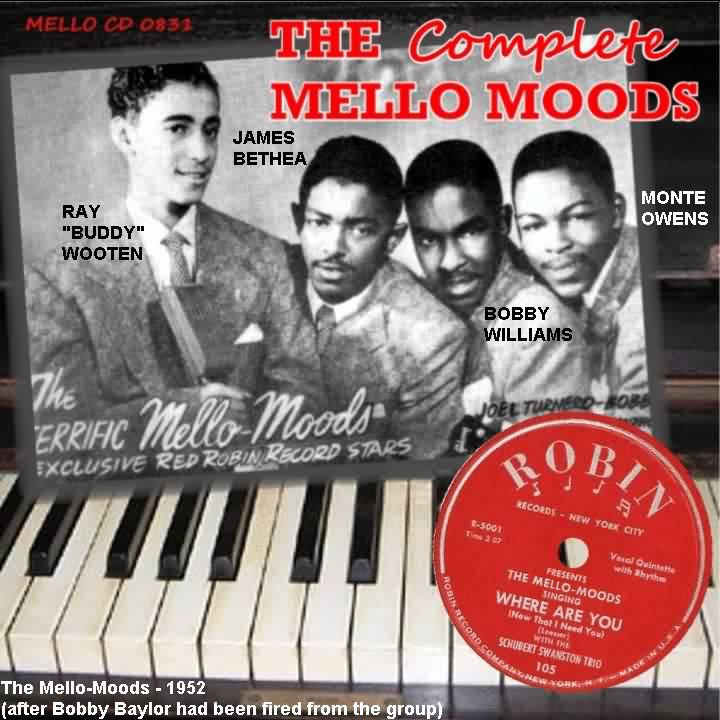 The start of the group that was to become the Mello-Moods goes back to 1949 or 1950. There were benches in the newly-built Harlem River Houses (a housing project on West 151st Street and 7th Avenue), and on these, four young kids started singing: Raymond "Buddy" Wooten (first tenor and lead; no one ever called him Ray), Bobby Williams (second tenor, second lead, and piano), Alvin "Bobby" Baylor (second tenor and baritone), and Monteith "Monte" Owens (tenor, baritone, and guitar). They all attended Resurrection Grammar School, also on West 151st Street, mostly as eighth graders. (They liked to sing on benches, there were others, down by the Harlem River, on which they also practiced.)