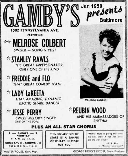 She was part of the January 1950 show at Gamby's (Baltimore), along with dancer/MC Eddie Crawford. On March 10, she was in a "mammoth" benefit show, for the Claremont Community Center, held at P.S. 55 in the Bronx. Among others appearing were W.C. Handy, Nipsey Russell, Eddie "Lockjaw" Davis, Blue Lu Elliott, Frank Culley, Willie Bryant, and the James Quintet. (Actually, it does sound pretty "mammoth".)