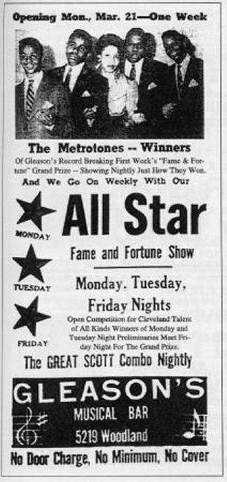 On March 4, 1955, the Metrotones won the weekly finals in the first "Fame And Fortune" contest at Gleason's Musical Bar (located at 5219 Woodland). The contests were held every Monday and Tuesday, with the winners returning on Friday night for the finals. (Once they won, however, winners never again competed.) Their prize, awarded by WSRS DJ Juanita Hayes ("The Sugar Lump of the Airwaves"), was a week's engagement at Gleason's, which began on March 21. The local press wrote them up by saying "Youthful, but tall in the saddle when they sing, ... the Metrotones ... rode to victory Friday night in the finals of the first week's 'Fame and Fortune' show, being staged at Gleason's Musical Bar." They were immediately added to the weekly show at the Circle Theater which began on March 6 and starred Guitar Slim. The ad for their Gleason's appearance urged patrons to come and see them since they're "showing nightly just how they won." Their March 4 win was followed quickly by an appearance at the Quincy Theater the following night.