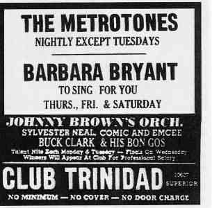 On September 8, 1955, the Metrotones began a 3-day stay at the Club Trinidad. The blurb was nice enough to mention their names (with only the usual misspellings): Charles Turner, Leonard Veal, Luvenia Eaton, James Frierson, and Melvin Smith. Later that month, they were booked into the Trinidad for a 4-week run.