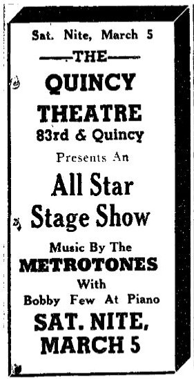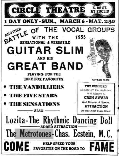 The Metrotones were also present at a four-day show, beginning July 1, 1955, at the Uptown Theater (St. Clair and East 106th). They shared the stage with Amos Milburn, Sonny Til and the Orioles, Margie Day, and local bandleader Rudy Brown and his Orchestra; the MC was comedian Tim McCoy. This would have been one of the first performances by Sonny Til's New Orioles.
