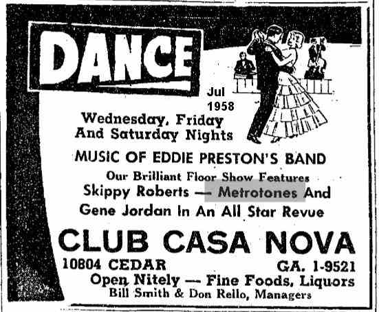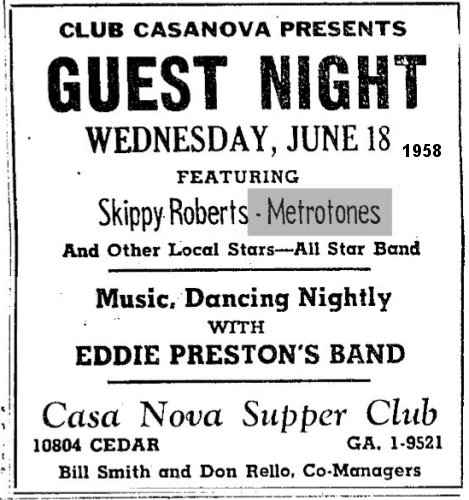 On June 28, 1958 the Metrotones were at the Club Casa Nova. The ad seems to indicate that it was only for a single night, but they were still there in July.