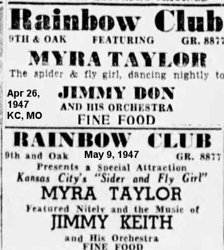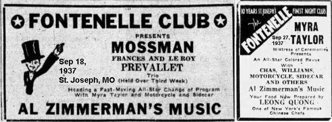 Meanwhile, in St. Joseph, Myra was singing at the Fontenelle Club. She ("swing singer") was first advertised on September 18, 1937. Also functioning as a dancer and MC, she'd be held over and was last mentioned on October 24. At the same time, Clarence Love opened at the 25 Klub in Dallas on a six-month contract.