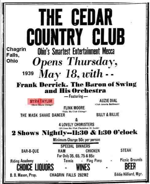 On May 7, she ("Miss Personality") was advertised as being at the Cedar Country Club in Chagrin Falls, Ohio, a suburb of Cleveland. The May 14, 1939 Cleveland Plain Dealer called her "a hotcha songbird". The show actually opened on May 18.