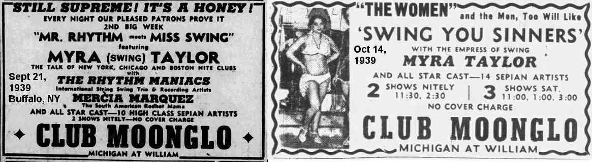 By mid-August, 1939, Myra was appearing at the Little Harlem in Buffalo, NY. A month later, she'd switched over to that city's Club Moonglo, where she'd remain for the rest of the year. The ads said "Mr. Rhythm meets Miss Swing", but failed to identify "Mr. Rhythm". In early December, she ("who sings classical numbers and nursery rhymes in swing time") held "battles" with Streamline Sue ("who warbles the latest popular songs in swing").