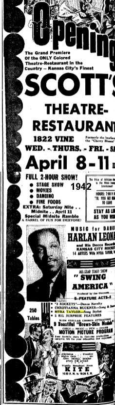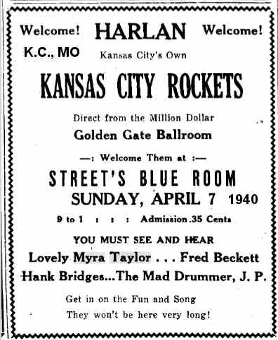 From April 8-11, 1942, the band was at Scott's Theater-Restaurant in KCM. The ad promised a full 2-hour show with a stage show, movies, and dancing. In mid-May, the Rockets began a long-term engagement at KCM's Fairyland.