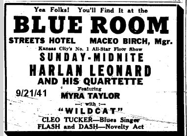 The January 19, 1940 Kansas City Call reported that "Myra Taylor, from the Three Deuces night club in Chicago, will appear as vocalist with [Harlan] Leonard's aggregation." This was when they were playing the Century Room in KCM that weekend.