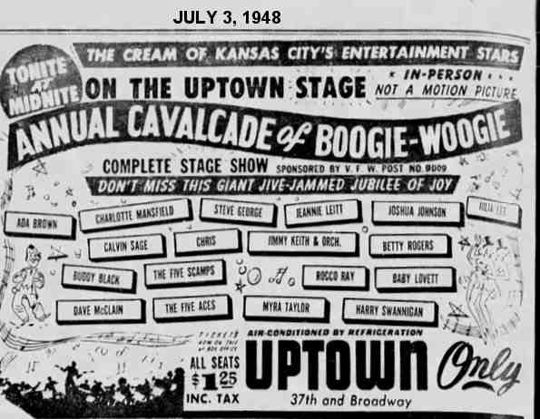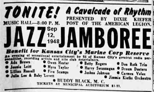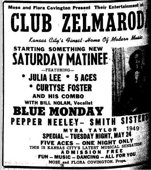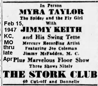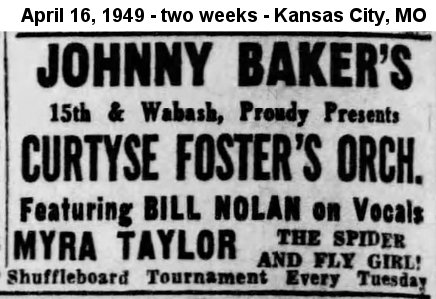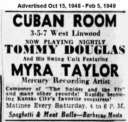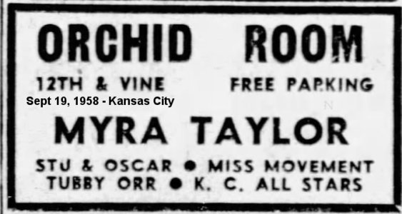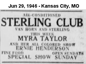 On June 23, 1941, the band was at the Kentucky Paradise (in KCM). The June 20 Call said: "It is the full-throated blues singing voice of Myra Taylor in the feature spot."