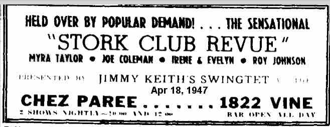 In early July, Myra was part of the "Bigger And Better Than Ever" revue at Chicago's Club DeLisa, also featuring Sam "Spo-Dee-O-Dee" Theard. They were both still there when the revue changed to "Rise And Shine" by early August. The August 13 Chicago Defender had this review: