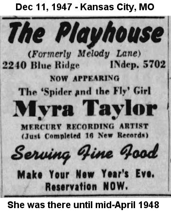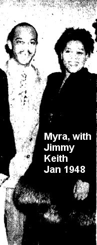 Myra was born and reared in Kansas City, Kansas [close], but went to Chicago to try her luck. She became a dancer at the famous Grand Terrace Cafe and then started singing. [There were a couple of blurbs that said she'd once been at the Grand Terrace, but it was in such a small capacity that she was never mentioned in any ads]