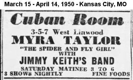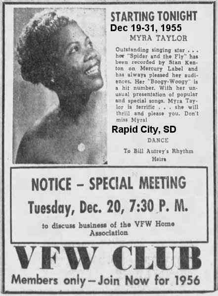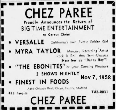 The October 31, 1958 San Antonio Register showed you how cheap newspaper space was. This is the entire blurb from Kellar Chase's column: "P. S. Tried my best to omit my very good friend of long standing, Myra Taylor, who is the featured singer on the show, plus she is a show stopper." Obviously space wasn't cheap enough for him to mention where she was singing.