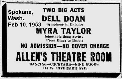 On February 10, 1953, she was at Allen's Theater Room in Spokane, Washington. She was called "Inimitable Song Stylist - From Blues To Boogie".