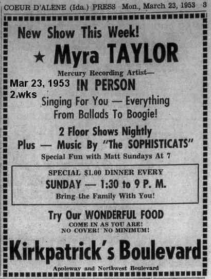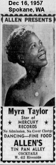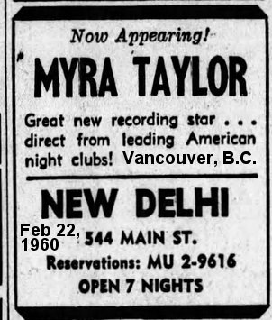 Right after that, she was off to appear at the Forbidden City in Honolulu, advertised on April 3. (Over 10 years later, she's still being advertised as "Mercury Recording Artist".) The April 9 Honolulu Star-Advertiser said "Myra Taylor, Forbidden City chirper, nabbed an eight-month contract for the Orient. Happy chop sticks." I've no idea where she played in the Orient. It may have even been longer, since she's not heard from again until December 16, 1963, when she was advertised as being on the New Year's Eve show at Vic's Theater-Restaurant, in Spokane.