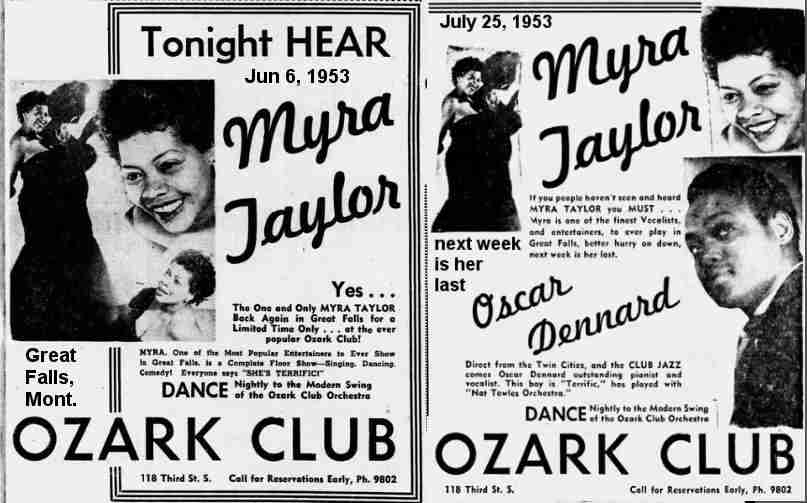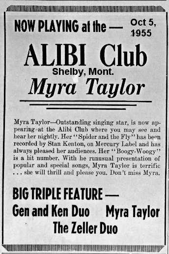 In mid-March, 1954, Myra was back at the Ozark Club. Also there was singer/pianist Doris Knighton, who had been with the Cats & The Fiddle. From July 26-August 21, she was at the Copper Club in Anaconda, Montana. Next was two weeks at the 97 Supper Club in Klamath Falls, Oregon, starting on September 28. (Their ad said that she has a recording out currently on both Capitol and Mercury labels. They're talking about "Spider", which was 8 years in the past; the Capitol recording was actually Stan Kenton's.) Another two weeks was spent at the Hi-Line Club in Havre, Montana, starting on November 2. (Their ad, too, said that she'd recorded for Capitol and Mercury.) Finally, she was advertised from December 7-11 at Clingman's Supper Club in Eugene, Oregon.