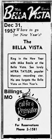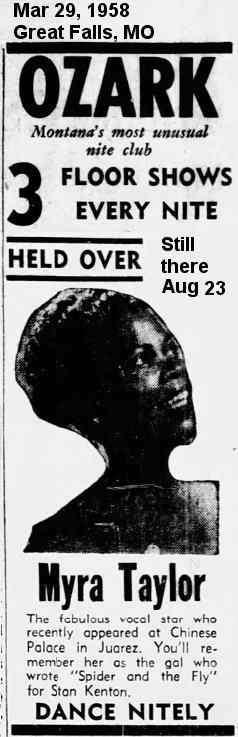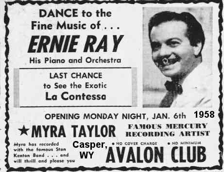 She immediately left Montana to open at the Avalon Club (Casper, Wyoming) on January 6, 1958. There was only the one ad, but it made sure to say "Myra has recorded with the famous Stan Kenton Band". Was she promoting that story? Who knows?