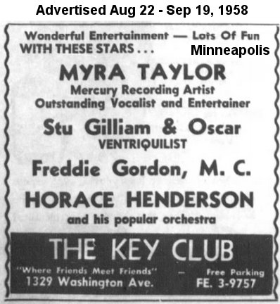 As I said, the last Ozark ad was on August 23, but the first Key Club ad (Minneapolis) appeared on August 22. As usual, I have no explanation. Also at the Key Club was ventriloquist Stu Gilliam and his doll, Oscar. On September 19, Lavern Baker was added, but it was the last time Myra was mentioned. Making my life even more fun, she (and Stu Gilliam) were both advertised as being at the Orchid Room in KCM on September 19, while she was also in Minneapolis. Even better: the September 21, 1958 Kansas City Star said that she "closes her engagement tomorrow night". Why me?